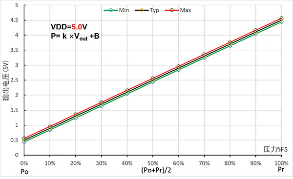 Opmerking: Vout is de analoge uitgangsspanning (eenheid: V); P is de drukwaarde (in kPa); k. B vertegenwoordigt de lineaire coëfficiënt en offset, zoals weergegeven in de onderstaande tabel.