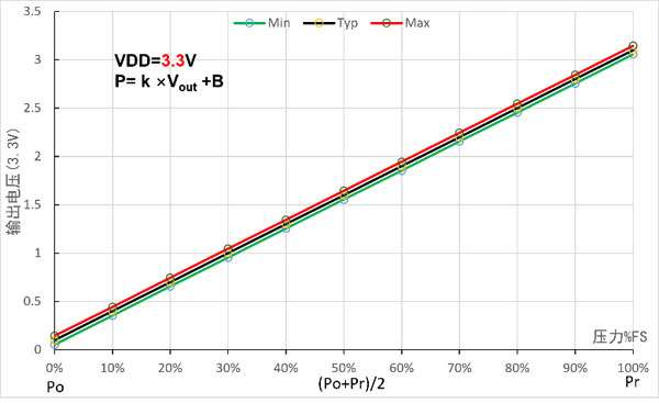 | Productmodel (3,3 V) | Bereik (kPa) | Uitgangsspanning (V) | Coëfficiënten en offsets | |||
